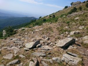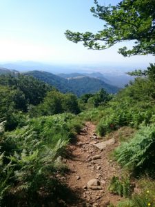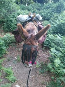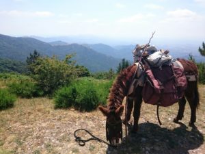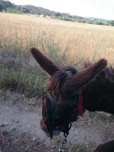 Wo fange ich an? Geschlafen habe ich letzte Nacht unter dem Innenzelt. Recht früh wach versorgte ich Neki und bereitete ihn für den Marsch vor. Doch irgendwas stimmte nicht, obwohl die Bauchgurte bis zum Ende zu waren, waren sie locker… Irgendwas hatte ich wohl beim Absatteln falsch gemacht. Oje… Hin und Her probiert, aber es wurde nicht besser und Neki wurde nervös… Trat ein paar mal…Aber nicht getroffen… Er hat eine empfindliche Stelle, wo er mal operiert wurde… Und einmal knappte er mich… Genug gequält armer Neki… So gut es ging alles festgemacht und los ging es weiter auf der Suche nach besserem Empfang. Dann Rücksprache und Fotoaustausch mit der Besitzerin… Mit Erfolg… Jipihh. Ich brauche wohl noch einen Esel Kurs. Das mit dem Wettziehen passiert ab und zu weiter… Aber dann geht es doch immer weiter…Mui bien Neki… Ich wollte ja Aktivurlaub… Jetzt habe ich meinen Fitnesstrainer dabei 🙂 An der ersten Wasserstelle nach dem Loslaufen angekommen, einem Hof, sagte mir eine Frau, daß ich den längeren aber einfacheren Weg nehmen soll…Das hat mich verunsichert, die steile Route mit Neki zu gehen und bin dann den Waldweg gegangen… Wenig Aussicht, dafür schön schattig. Dann bin ich irgendwann auf einen alten Bekannten gestoßen, den GR10, den ich vor 2 Jahren gelaufen bin….bekannt kam er mir zunächst nicht vor, erst als ich am col angekommen war und die Herberge Gastronomie gesehen hatte, wusste ich – hier war ich zelten. Jetzt bin ich in Frankreich. Heute habe ich hier ein Bett und einen Stall für Neki. Das letzte Stück ging runter… Das ist etwas tricky mit Esel.. Hat aber letztendlich geklappt. Da meine Seife ausgelaufen war, gab’s heute nur Dusche ohne. Ich freue mich schon auf Abendessen. Neki grast schon die Wiese ab.