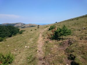 Ein herrlicher Blick beim Frühstück über die Pyrenäen. Danach heißt es Neki startklar machen und los..entspannt zunächst über eine Asphalt-Piste… Ich hatte ja von der Besitzerin tracks für die Route bekommen, die ich in mein Smartphone Navi geladen habe. Aber es kommt ab und zu vor, daß die Route durch einen Zaun läuft… Ohne Durchgang oder nur ein schmaler… Manchmal ergibt es sich von selbst, wenn man einfach weiter geht… Aber einmal hatte ich die Hoffnung schon aufgegeben und hatte mich auf campieren eingestellt… Dann sah ich ein Kalb wie es an einer Stelle durch einen Zaun ist.. einfach zwischen die Schnüre durch….Und die gaben nach… Dann sah ich, dass es eine Art Spanngurte waren, mit Haken an einer Seite… Klar.. Zum Aufmachen, da kann dann ein Auto durch… Supi… Dann war da noch die Sache mit dem Kalb auf der anderen Seite des Zauns und der Mama auf unserer Seite, die schon mal etwas auf uns zugegangen ist, stehen blieb und beobachtete. Nun gut….ungutes Gefühl hin und her… Einen Bogen um die Mama geschlagen, die Absperrung geöffnet, Blick auf Mama – entspannt…. Dann durch und wieder zugemacht… Geschafft 🙂 Was soll mich das lehren? Flexibel sein…Nicht so schnell aufgeben.. Kühlen Kopf in stressigen Situationen bewahren und mehr Selbstvertrauen. Also weiter ging es über enge Pfade, quer durch den Wald (indem Kühe rumliefen) ohne Weg, auf steinigen und steilen Wegen… Hänge hinab… Und ja… Neki ist eine coole Socke… Eben ein alter Hase… Ich glaube, das liegt ihm…Aber Bergauf müssen wir manchmal um die Wette ziehen… Er versucht es immer mal wieder zu blocken… Zu guter Letzt wurden wir mit einer herrlichen Aussicht vom Berg auf das Meer belohnt und es ging das letzte Stück zum Ziel… Hier wurde es noch mal etwas aufregend, als wir durch eine Kuh Herde durch mussten… Manche standen Schulterhoch im Fan… Nicht zu erkennen, ob es eine Kuh ist oder ein Bulle… Kühe habe ich hier auch schon gesehen, welche richtige Muskelpakete waren… Nun gut… Bei einem Tier war ich mir nicht sicher und beobachtete es beim Umlaufen….geschafft… Morgen muss ich einen Teil der Strecke wieder zurück.