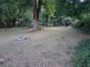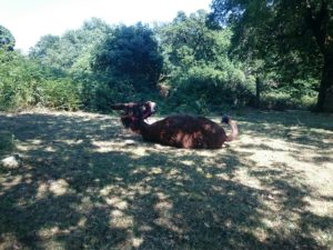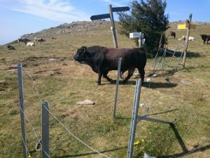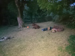 Gestern ziemlich fertig am Tagesziel angekommen. Ich konnte zunächst nichts essen…..Das Picknick Paket, daß ich von der Herberge mitnahm, musste noch etwas warten… noch nicht mal die Schuhe wollte ich ausziehen… Habe einfach nur da gesessen und mich fallen lassen… Es war von allem die mentale Anstrengung des Tages, die mich mitgenommen hat. Und nicht genug, da waren auch wieder Kühe oder Rinder, mit Hörnern und hatten auch Kälber dabei. Der Ort an sich war schön, mit Bach unterhalb, grüner Wiesen. Problem waren nur die Viecher, zum Glück hatten die Glocken und man hörte als die Herdentiere nacheinander an unserem auserwählten Schlafplatz eintraf. Jede einzelne fixierte uns Minutenlang…Keine Ahnung was das war.. Angst… Drohung… Die Kälber waren teilweise neugierig und kamen auf uns zu, aber auch schreckhaft und ich war total unsicher… Auch mit Neki… Wie reagieren alle aufeinander… Mir wurde die Sache dann too much und wir zogen etwas weiter auf eine kleine Wiese mit Baum, umgeben von Hecken und Zäunen mit drei offenen Zugängen….Und natürlich, die Herde war ja frei und fröhlich am wandern und unsere Wiese wurde wohl auch regelmäßig besucht, dann kam die erste Kuh mit Kalb und fixierte uns… Dann rief ich und sie liefen weg… Dann kam die nächste… Die kam schon näher.. Ich versuchte es mit rufen… Fehlanzeige… Habe Neki geschnappt und bin etwas weg…Sie kam näher… Dann auf einmal ist sie von selbst aufgeschrocken weg gegangen…. Dann etwas später kam die Herde, guckte und wollte langsam einmarschieren.. Ich gab irgendwann nochmal einen Laut… Sie zogen weiter… Pfff… Soviel Aufregung.. Was ich nicht gebrauchen kann, ist eine Herde Viecher nachts..und Neki würde ich ja nachts anbinden…Alles zu unsicher.. Also entschloss ich mich, Fluchtbereit zu bleiben… Kein Zelt, keine Matratze, kein Schlafsack… schlafen auf der Zeltunterlage mit Klamotten…naja schlafen ist gut…Viel ist es nicht geworden, die meiste Zeit war ich wach… Ausserdem hatte ich die nächtliche Kälte auf der Höhe unterschätzt… Hatte zwar alles dabei, entschloss mich aber eine l Plane und der Zwischendecke von Neki über mich zu legen… War aber immer noch kalt…. Neki graste vor mir und ab und zu legte er sich hin. Die Kuhglocken hörte man durch die ganze Nacht aber sie blieben fern. Sobald es hell genug war, Wasser holen, Neki versorgen und schnell los. Erstmal im Gestrüpp den falschen Weg genommen, wieder etwas zurück und dann auf den richtigen Pfad gekommen. Irgendwann kam ich wieder an einen Zaun mit der Absperrung die man lösen konnte. Problem waren nur zwei lautstarke Bullen, jeweils auf einer Seite in der Nähe des Durchgangs.. What the f***… Keine Ahnung… Eigentlich ist es ja ein Durchgang… Aber wie reagieren die gerade hormonell geladenen Jungs… Pfff… Alternativ Route? Schon mal SMS und email an die Besitzerin abgesetzt… Dann sah ich den einen Bullen etwas weiter weg vom Durchgang… Den anderen gar nicht mehr.. Gut oder schlecht? Ach, los Neki… Ihm war immer noch nicht wohl bei der Sache… Den ersten Versuch hatte ich schon mal abgebrochen, als ein Bulle auf mich zu kam. Jetzt aber… Aufgemacht, Neki durch, zu und schnell an der Herde seitlich vorbei… Geschafft 🙂 Dann auf abenteuerlichen Pfaden am Hang bergabwärts… Schlecht zu sehen, wie der Weg läuft …Viel ist zugewachsen…Und dann ja…Wir haben uns durch Dornengestrüpp gearbeitet … Armer Neki mit den seitlichen Taschen… und dann geht es nicht mehr weiter… Blick auf das Smartphone GPS… Wir waren zu weit oberhalb… Ich suchte den Weg, ließ Neki kurz alleine, aber der hatte es wohl schon längst gecheckt und lief ein Stück zurück… Dank GPS den richtigen Pfad gefunden.. Jipihh… Strecke blieb schwierig… Aber Neki war in guter Form…nahm wie es kam… er überlegte an schwierigen Stellen erst und ging dann los… Er war richtig auf Zack…Auch in schwierigen Situationen gönnte er sich zwischendurch einen Snack… Je nach dem was da so gerade wuchs… Ab und zu machte er sich glaub ich einen Scherz mit mir, wenn ich rechts am Baum vorbei lief, er links. An einem Durchgang für Personen, musste ich den Stacheldrahtzaun aufdrehen, damit Neki durchkam.. So gut wie es ging wieder zu und weiter bergab zum Ziel… Geschafft für heute… Neki hat direkt ein Sandbad genommen und ist erstmal liegen geblieben. Tapferer Neki.
