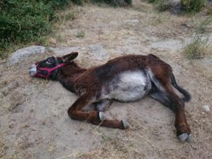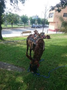 Ja…letzter Tag, ich bin schon am Ausgangspunkt in Espolla, hier habe ich wieder Empfang. Werde noch bis zur Esel Ranch weiterlaufen. Ist erst 11h. Was ist gestern noch so passiert? Ich sah an unserem gestrigen Zielort schon Kuhfladen.. Selbst in der Ruine… Kühe laufen hier echt überall rum… Ich sah aber keine Kühe und hoffte, daß es so bleibt. Nachdem Neki wieder langsam fit wurde, suchte ich uns ein Plätzchen… Nah beieinander aber nicht zu nah, damit er nachts nicht über mich läuft… Etwas weniger als die Seillänge… Ich habe mir dann das Innenzelt aufgebaut, was eine gute Entscheidung war, da bald schon recht viele Stechmücken kamen, und Matratze rein und drauf mit mir..Es war ja erst nachmittags, aber ich war so müde, dass ich ein paar mal eingeschlafen bin. Einmal bin ich durch einen Laut wach geworden…möglich, dass es Neki war, der wie ein Wachhund mit Ohren nach vorne etwas weiter weg fixierte…. Oder es war die Kuh, die er dort sah und die ihn fixierte. Ich schnell Schuhe an und aus dem Zelt, wollte mal auf die Kuh etwas zulaufen, aber als ich an Neki vorbei bin, er mir nach wollte, aber wegen des Seils nicht weiter konnte, rief er….Da bin ich bei ihm geblieben und die Kuh ist von alleine wieder zurück gelaufen und kam auch nicht wieder. Wir campierten ja direkt an einem Wanderweg, der wohl auch von Kühen genutzt wird. Neki schrie schon öfter mal nach mir als ich weg ging… Meistens um Wasser zu holen… Auch für sein Kraftfutter anzumischen… Manchmal als ich ihn ohne Leine ließ, lief er mir nach… Er wusste schon am ersten Tag aus welcher Hosentasche die Leckerlies kommen 🙂 . Mit Essen für ihn hat man schon mal Pluspunkte. Heute Morgen ging es recht früh los… Meist auf angenehmen Wegen, auf denen man durchatmen und genießen konnte… Wir waren schon früh in Espolla, deswegen wollte ich nach einer Rast weiter zur Eselfarm laufen… Etwas über 9km….also noch meinen heutigen Blog angefangen zu schreiben… Und nachdem Neki dann noch als Fotomodell für ein Pärchen hergehalten hat, ging es weiter…. Einfache Wege auf denen ich auch mehr mit Neki kommunizieren konnte….Schön… Ich genoss die letzten Stunden mir ihm….Neki wollte ab und zu mal traben…das sollte er auch gerne machen…also trabte ich mit. Irgendwann aber fing er an einfach loszurennen und ich musste ihn mehrmals stoppen… Das wurde anstrengend und ich wusste nicht was er hat…Wollte er schnell nach Hause? Er wackelte auch manchmal schnell mit dem Kopf… Irgendwann bemerkte ich die vermeintliche Ursachen… Da saß eine Pferdebremse auf seinem Kopf… Fiese Viecher… Die habe ich abgemacht… Danach war der Spuk vorbei…Irgendwann kamen wir an die letzten Meter vor der Ranch und Neki blieb stehen und wollte umdrehen… Och Nee Neki…Nicht auf den letzten Metern zicken… Ich zog ihn weiter, als ich dann wehmütig feststellte, dass wir zu weit gelaufen sind und ich einen unscheinbaren kleinen Pfad übersehen hatte, der von der Piste in den Wald ging und zu dem Neki einfach nur wohl zurück wollte… Natürlich entschuldigte ich mich…Auch mit Leckerlies… Dann kamen wir auf die Farm, Neki abgesattelt, nochmal gedrückt und die letzten Leckerlies gegeben… Dann auf die Koppel gebracht… Ich schaffte es gerade so, das Halfter abzunehmen, während er schon nach unten ging, sich in den Sand schmiss und ausgiebig badete. Fortsetzung folgt…